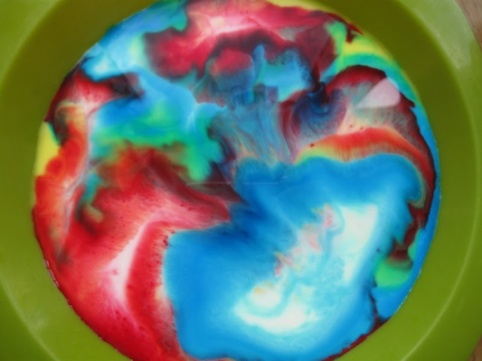 Итак, наливаете в тарелку молоко, чтобы оно полностью покрыло дно. Дайте ему немного постоять. Теперь капаете пищевой краситель на молоко. Дальше покажите малышам сухую ватную палочку и как Вы ей касаетесь молока. Просто коснитесь, не нужно смешивать краски рукой. Что получилось? Верно, ничего. Теперь окуните другую палочку в жидкость для мытья посуды либо в жидкое мыло и коснитесь, просто коснитесь, молока в центре на протяжении 10-15 секунд. Ну как? Детки в восторге? Вот Вам и волшебная ватная палочка! Настоящий взрыв цвета в молоке, разве не так?