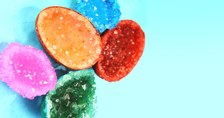 После того как скорлупа высохнет, переходим к следующему этапу. Растворяем пакетик красителя в двух стаканах воды и помещаем в него яйцо. Если, к примеру, яйцо поместили в раствор с утра, уже к вечеру на нём будут видны кристаллы. Чем дольше яйцо находится в растворе, тем крупнее будут кристаллы. Вынимайте хрустальное яйцо аккуратно — влажные кристаллы довольно хрупкие. Обязательно наденьте перчатки, чтобы защитить кожу рук.