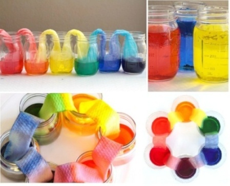 Посмотрите, как интересно получается — окрашенная вода движется по салфетке и стекает в пустой стакан. Смешиваясь, обе жидкости дают новый цвет.