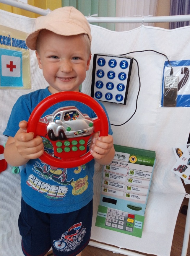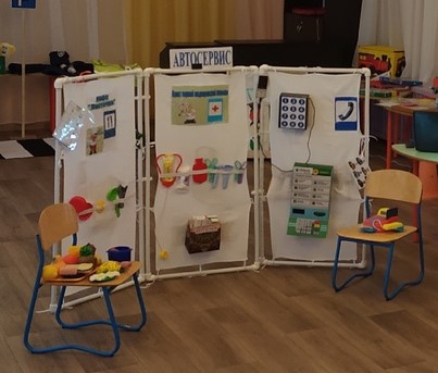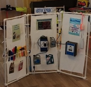 На ширме мы разместили: автозаправку,мойку для машин, СТО, кафе, пункт первой медицинской помощи и офис связи.Ширма многофункциональна в использовании, небольшая и легко переносится в любой уголок групповой комнаты. Она сделана из полипропиленовых труб, представляет очень легкую конструкцию, безопасную для детей. Экраны ширмы сделаны из ткани, которая легко стирается. Все атрибуты сделаны из коробок разной величины и обклеены самоклеящейся пленкой и прикрепляются при помощи липкой ленты. В пополнении развивающей предметно пространственной среды принимали участие не только воспитатели и родители, но и дети, они изготовили атрибуты из соленого теста и подручных материалов для игры «Кафе» и «Магазин». Родители помогли не только в изготовлении ширмы, но и сшили модели автомобилей, а так же изготовили костюмы для сюжетно-ролевых игр.