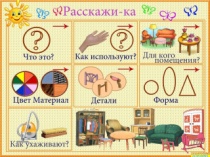Педагог: - Ребята, а сейчас мы с вами попробуем составить рассказ-описание о любой мебели по схематическому плану.