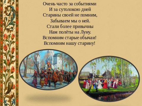 Сегодня мы на многое начинаем смотреть по иному, многое для себя заново открываем и переоцениваем. Это относится и к прошлому нашего народа. Большинство людей, к сожалению, поверхностно знакомо с народной культурой. Как жили русские люди? Как работали и отдыхали? Как они соблюдали традиции и обычаи? Какие игры и игрушки были у детей? Ответить на эти вопросы – значит, восстановить связь времён, вернуть утраченные ценности. Для этого надо обратиться к истокам русской народной культуры, истории Руси. Чтобы воспитать в детях гордость за свой народ, поддержать интерес к его истории и культуре, помочь лучше узнать прошлое своего народа и был создан данный проект.