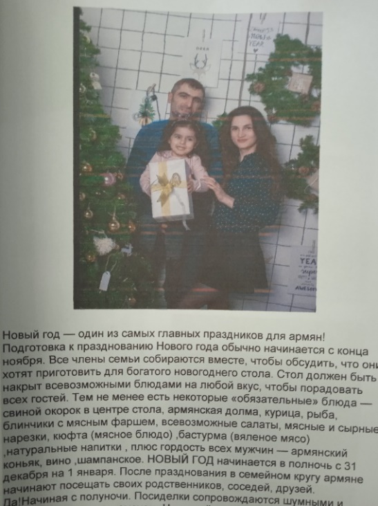Ноябрь | Знакомство с армянской народной культурой,сказками: Азаран Блбул Айцатур Безрукая Волшебная роза (армянская сказка) Беседа: «Как у вас в семье празднуют праздники?» (по традициям армянского народа) | Мастер-класс «Как провести исследование вместе с ребенком». Консультации для родителей: «Россия-многонациональная страна», «Ознакомление детей с народами разных стран». |