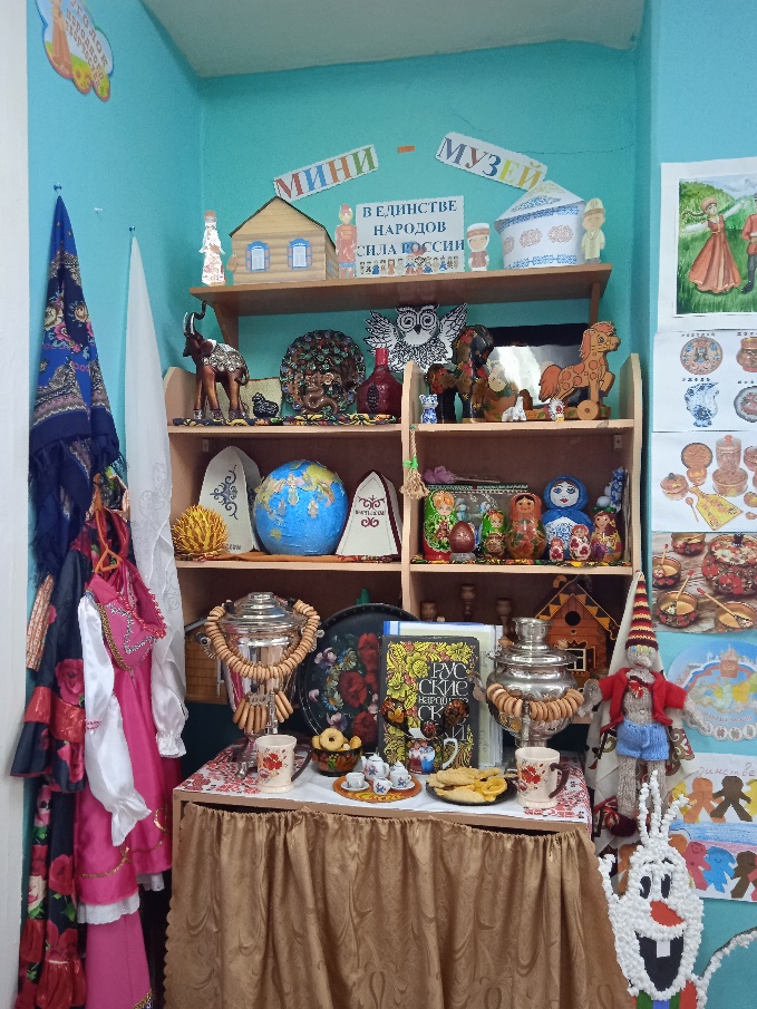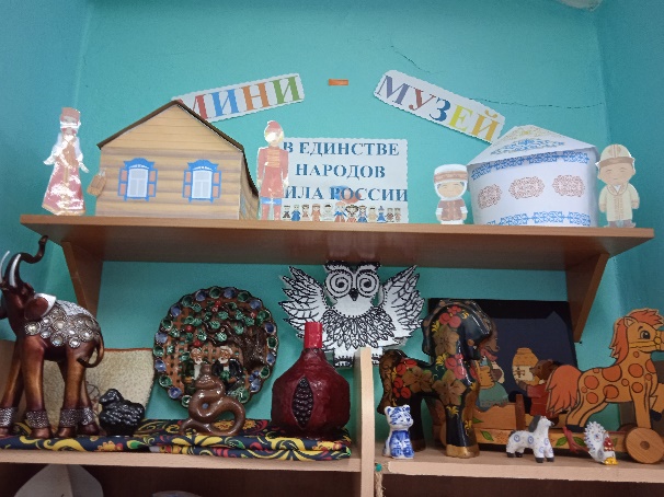 Мини- музей "В единстве народов сила России".Создание мини - музея помогает развить у детей дошкольного возраста интерес к истории и культуре своего народа, учит уважать его традиции, воспитывает патриота. В нашем мини-музее представлен экспонаты разных народов.