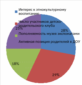 -повысился уровень компетентности родителей в вопросах этнокультурного воспитания детей, в организации работы по этнокультурному музею и оснащению пространственной предметно-развивающей среды.