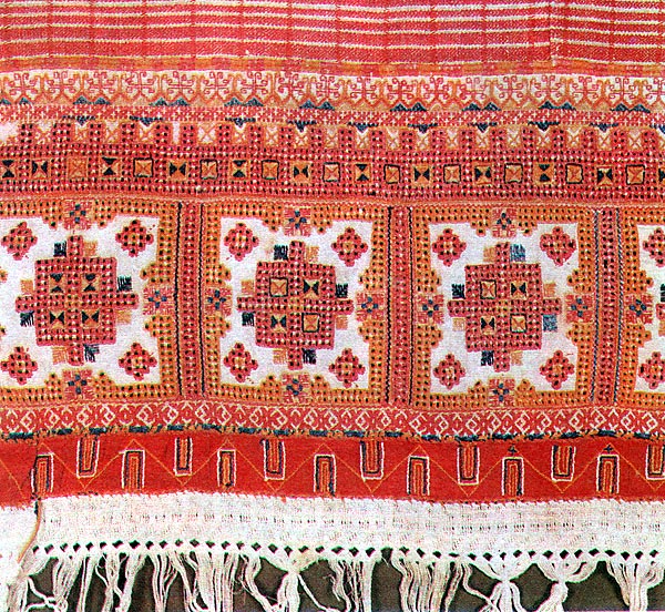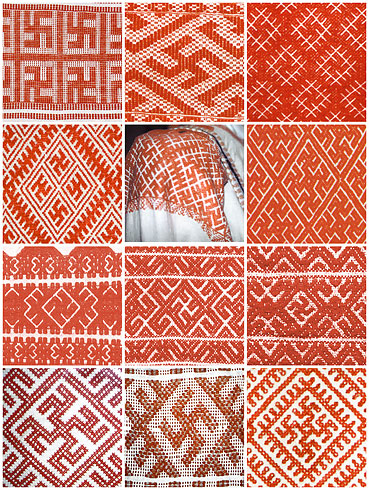 Вышивка перевитью, или, как её еще называют, строчкой очень характерна для Смоленщины. Узоры из больших и малых ромбов, гребенок, крестов набиралась цветными нитками (Рис. 3). Получалась как бы мозаика. Основной красный цвет «поваживался» - подчеркивался другими цветами. Выделяя не только цвет, но и определенный узор. Помимо перевити, распространена была на Смоленщине и настебка. Это двусторонняя вышивка, но без продергивания ниток. Существует так же настил, где узор накладывается поверх ткани.