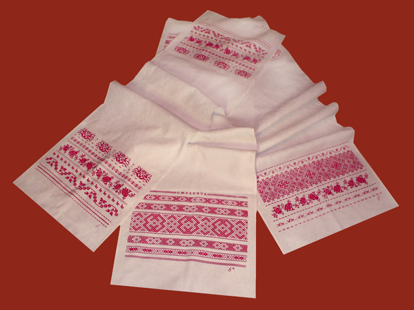 В смоленских орнаментах издавна часто встречалась так называемая свастика, которую часто ассоциируют исключительно с нацизмом, однако это один из самых древних символов, использовавшихся многими народами мира. Очень широко она была распространена на Смоленщине во времена язычества. Этот знак символизирует солнце, могущество и изображается против часовой стрелки. Так на полотенцах для новобрачных крест и одолень-трава – оберег здоровья, знак гармонии, а крест с буквой «П» - уже символ продолжения рода. В этих орнаментах зашифрованы многие знания, которые наши предки передавали из поколения в поколение, к сожалению, сейчас многие значения знаков утрачены. К празднованию юбилея города Смоленска Людмила Грамажора разработала юбилейные салфетки, которые пришлись по душе, как гостям города, так и самим смолянам (Рис. 6).