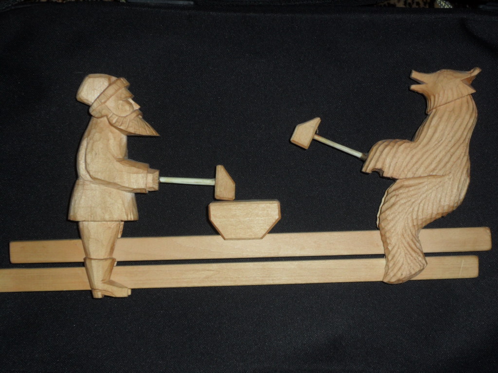 Россия самая лесная страна в мире (45% территории покрыто лесом, в основном хвойным). Логично, что во многих районах нашей страны развито декоративно-прикладное искусство художественной обработки древесины. Деревянная резьба для Смоленщины – традиционный вид ремесла, которое прежде называлось резным делом. Промысел возник в конце 16 века. Самый популярный товар того времени деревянная игрушка - Кузнецы, изображающая мужика и медведя, поочередно бьющих по наковальне. Стоит подвигать планками и тут же начинается бойкая работа. В четком ритме двигаются фигурки, в такт стучат по наковальне молотки. Материалом для резьбы служит мягкая древесина: осина, ольха, липа. Для изделий характерно сочетание орнаментальной тонкой резьбы с гладкой поверхностью. Резчики выполняют резьбу без предварительных эскизов — смаху, отсюда возникло название «маховая резьба». Продукция промысла — декоративная скульптура и оригинальная игрушка с движением — всегда была популярной, привлекая внимание своеобразием и тонкостью резьбы, а также красотой белого неокрашенного дерева. Мастера вырезают фигурки зверей, особенно любят изображать медведя: медведь-фотограф, медведь-электросварщик, медведь-трубочист, медведь-плясун, медведь с балалайкой.