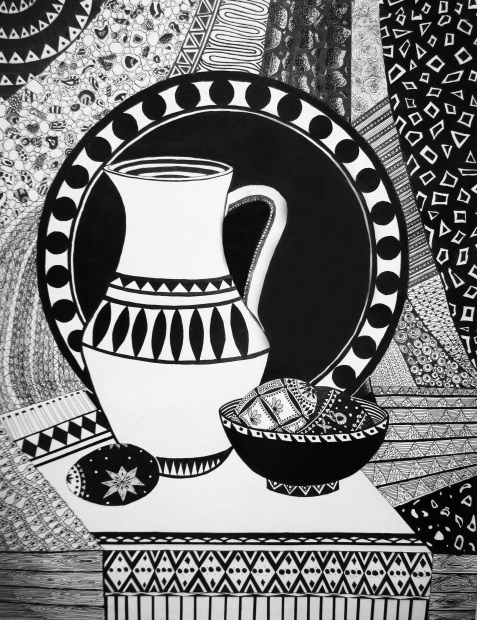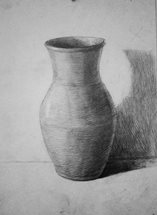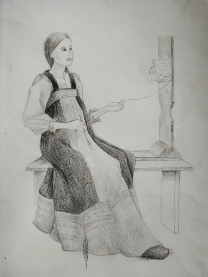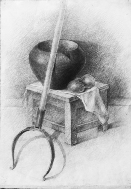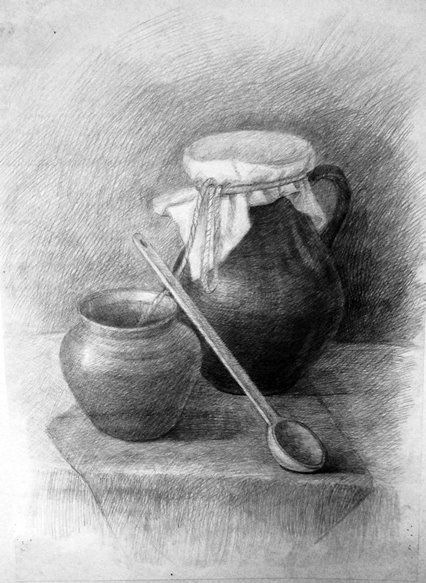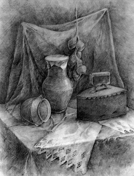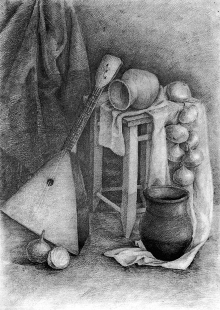 На своих уроках по рисунку при постановке натюрморта чаще стараюсь использовать старинную русскую посуду и деревенскую утварь. Этими предметами наш натурный фонд иногда пополняют сами ученики, с увлечением разыскивая старые глиняные горшки , плошки, деревянные предметы в деревнях у бабушек. Уже в первом классе после начальных развивающих моторику руки упражнений, освоив принципы построения, первый предмет который рисуют дети – это крынка (рис. 1) . Потом в постановках появляются различные горшки, чугунки, деревянные ложки, ухваты и т.д. В старших классах это более сложные предметы – прялки, утюги , самовары (рис2 – рис.6). В качестве драпировок иногда использую старинные полотенца с вышивками и ручным кружевом. (рис.7) . Выполняли мы на народную тематику и декоративные натюрморты (рис. 8, рис.9). При этом , объясняя законы изобразительной грамоты, я всегда стараюсь как можно интереснее рассказать о самих предметах старины. Ведь многие дети никогда не видели и не знают об их предназначении и применении. В четвёртом классе , рисунок фигуры человека будет выполняться учащимися с большим интересом, если одеть натурщицу, например, в русский сарафан и лапти (рис.10)).