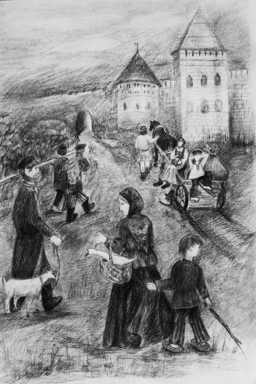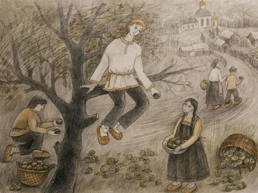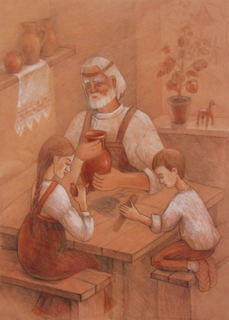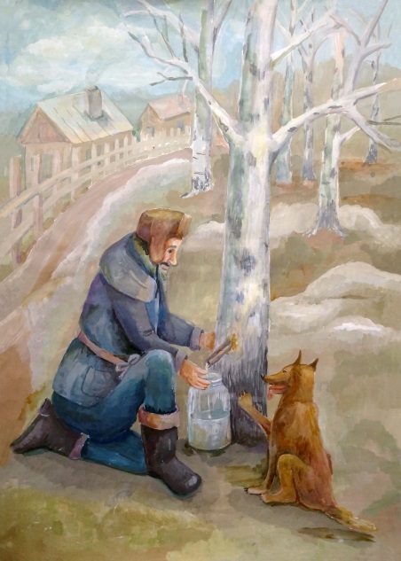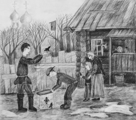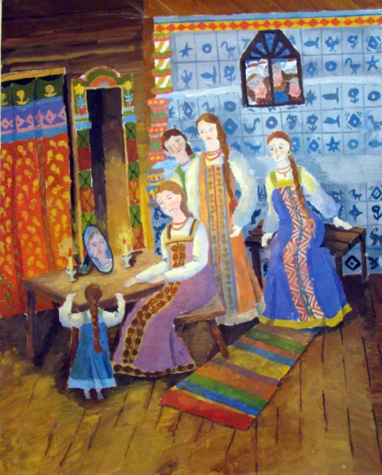 Большой простор для изучения русской народной культуры на уроках по станковой композиции. Тема «Народный праздник» позволяет дать представление о русских народных праздниках, их значении в жизни наших предков. В ходе этих занятиях хорошо использовать народный фольклор. Чтобы сделать объяснение более ярким и эмоциональным, включить, например, музыкальное сопровождение (народные песни), народные пословицы и поговорки. Можно поручить учащимся сделать небольшие доклады о народных праздниках, например, по временам года. Работы могут быть выполнены различными материалами, наиболее удачно подходящими к выбранному сюжету. ( рис 11 – рис. 13) .Ещё одна тема композиции «На своей земле» также даёт учащимся возможность изучить и изобразить народные обряды, традиции и обычаи , раскрывающие душу русского человека. Для примера, выбранным сюжетом может стать ярмарка (рис. 14) , изготовление глиняной игрушки (рис.15). Сбор берёзового сока – это тоже чисто русское занятие (рис.16) .