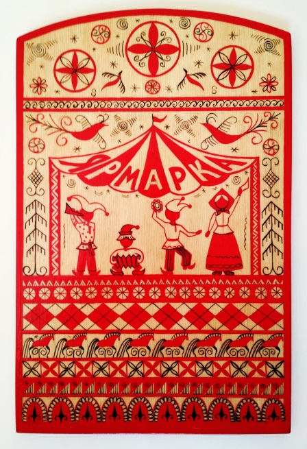 Сначала мы расписывали доски, выбирая только традиционную для этой росписи многоярусную композицию. Работы получались простые , незатейливые, но интересные. (рис. 17, рис.18)). Затем роспись стала более профессиональная (рис.19). А сейчас мы ещё больше усложнили задачу и вводим в композицию какой то сюжет. Это может быть народный праздник (рис.17) , любая пословица или поговорка, стилизованная в стиле мезенской росписи (рис. 18), или , например, та же ярмарка (рис.19).
