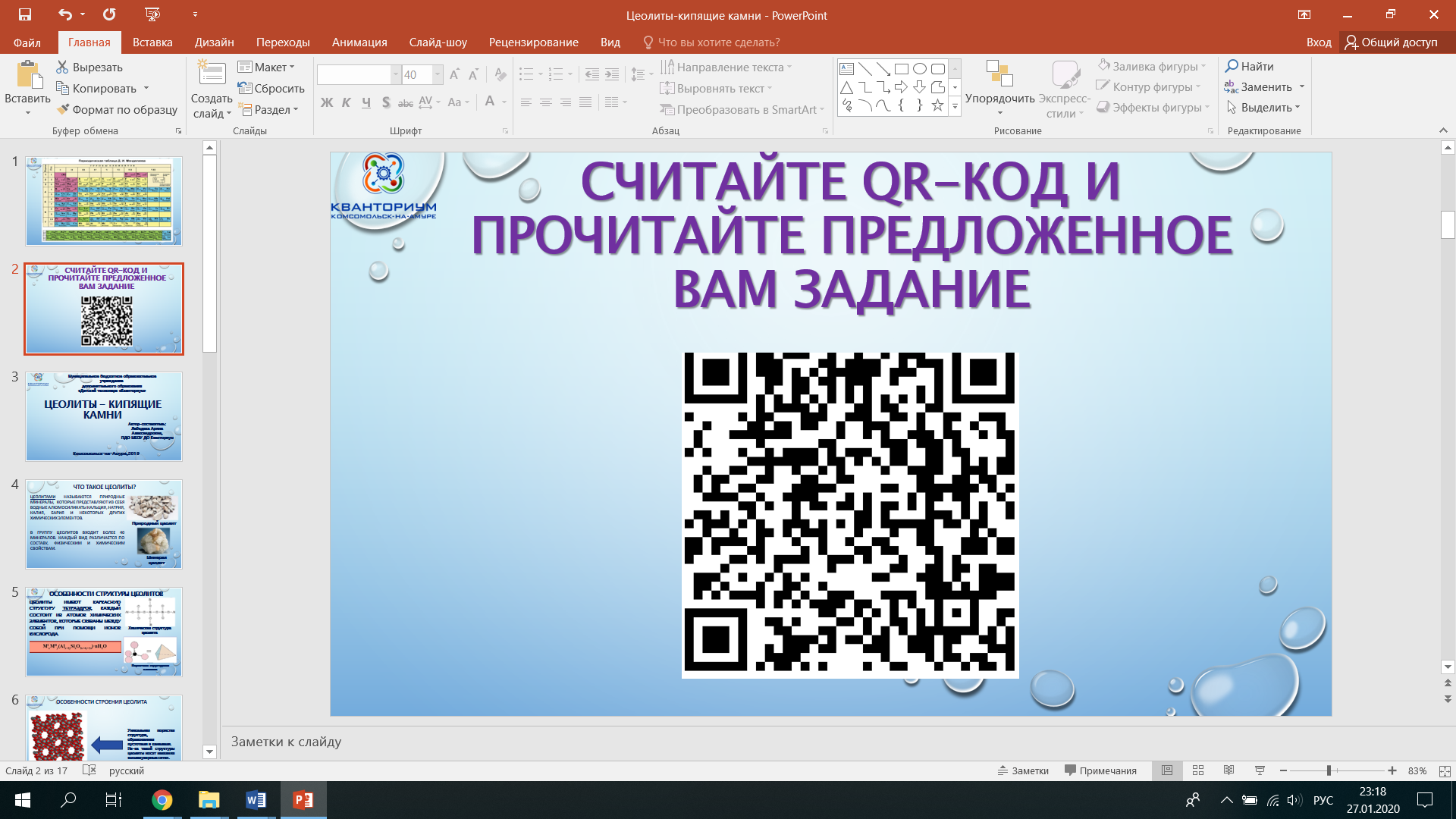 Оборудование и материалы: мультимедийное оборудование; презентация к занятию «Цеолиты-кипящие камни» (Приложение 1), 2 ноутбука (доступ в сеть Интернет), 2 планшета или смартфона (доступ в сеть интернет), приложение для считыванияQR-кодов, образцы природных и синтетических цеолитов, дистиллированная вода(или кипяченая), чашки Петри, химические пробирки на 10 мл, химические плоскодонные колбы на 250 мл, химические воронки, нагревательные плиты, электронные термометры, лупы, линейки, аналитические весы, шкалы Мосса, магнитные мешалки, ложки-шпатель, стеклянные палочки, фильтровальная бумага, химические штативы, растворы HCl (10 мл), NaOH (10 мл), сульфата железа (III), гексацианоферрат(III) калия, магнитная мешалка.