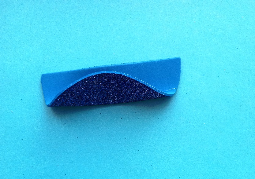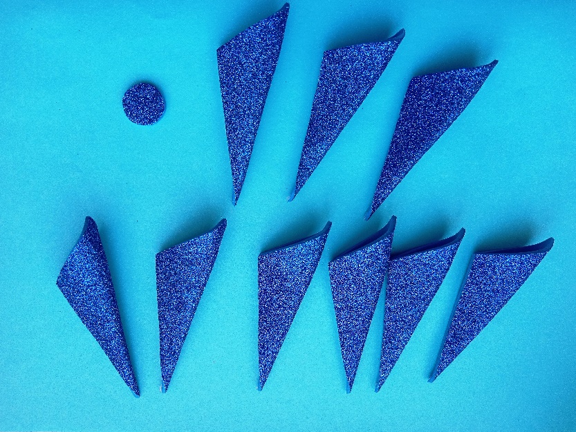 Шаг 1. Делаем заготовки деталей. 1) Обводим детали шаблона юбочки на изнаночной стороне фоамирана, используя зубочистку. (9 шт.) Это следует делать аккуратно, не сильно надавливая на фоамиран во избежание его повреждения. 2) Обводим деталь крыльев, вырезаем. 3) Обводим и вырезаем круг для подклейки. 4) Отрезаем из остатков фоамирана полоску шириной 1 см и длиной 3-4 см. |