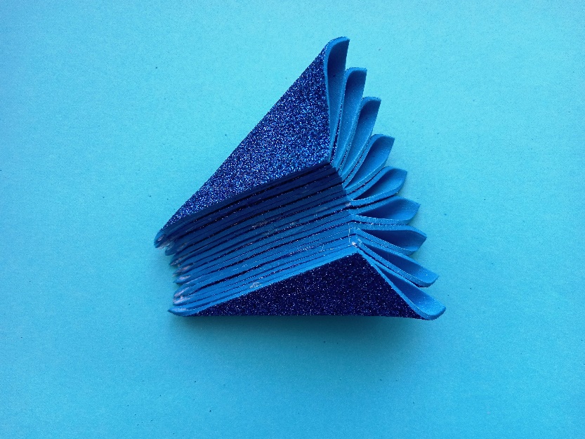 Шаг 4. Делаем крылья. 1) Деталь крыльев складываем пополам блестящей стороной вверх. По центру склеиваем небольшим количеством клея, до середины детали. 2) Далее детали крыла с двух сторон сворачиваем блестящей стороной внутрь, выравниваем и склеиваем посередине 3) Подготовленной полоской оформляем середину крыльев, при этом место схождения полоски должно быть снизу. Острые кончики крыльев смотрят вверх! Крылья готовы! |