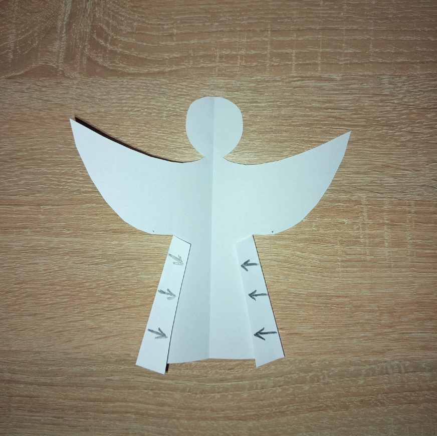 3. Вырезаем ангела по контуру нарисованному карандашом. Под крыльями делаем надрезы диаметром 1 см.