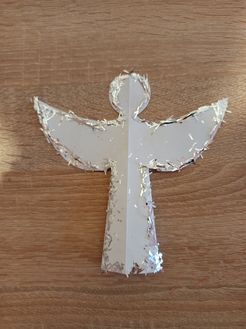 7. Края поделки проклеиваем клеем и посыпаем мелкими кусочками мешуры по контуру ангела.
