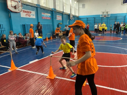Два конуса + один, после которого участники двигаются в обратную сторону. Волонтеры демонстрируют эстафету