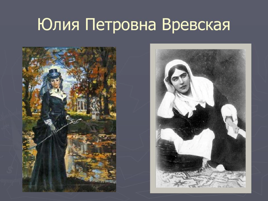 Она появилась на свет в 1838 г. в семье генерал-майора Варпаховского. В 18 лет Юлия вышла замуж за 44-летнего генерала Ипполита Вревского и стала баронессой. Этот брак продлился недолго – через год муж скончался после ранения в бою. Вдову генерала приняли в Петербурге со всеми почестями, она стала фрейлиной двора императрицы Марии Александровны.