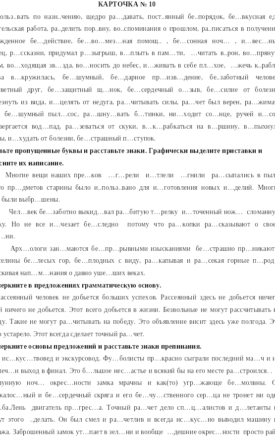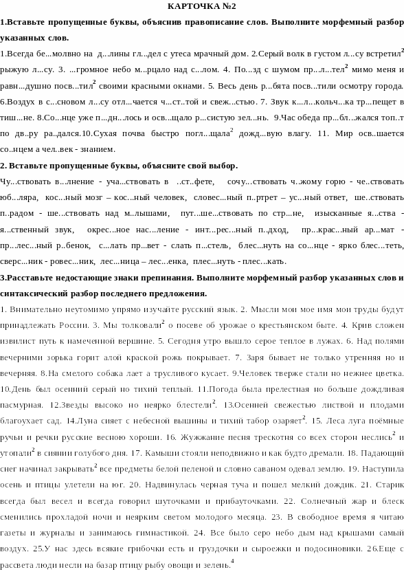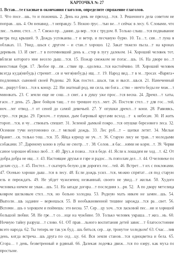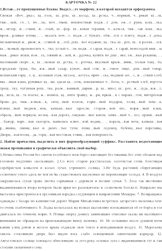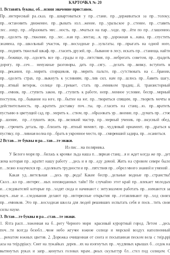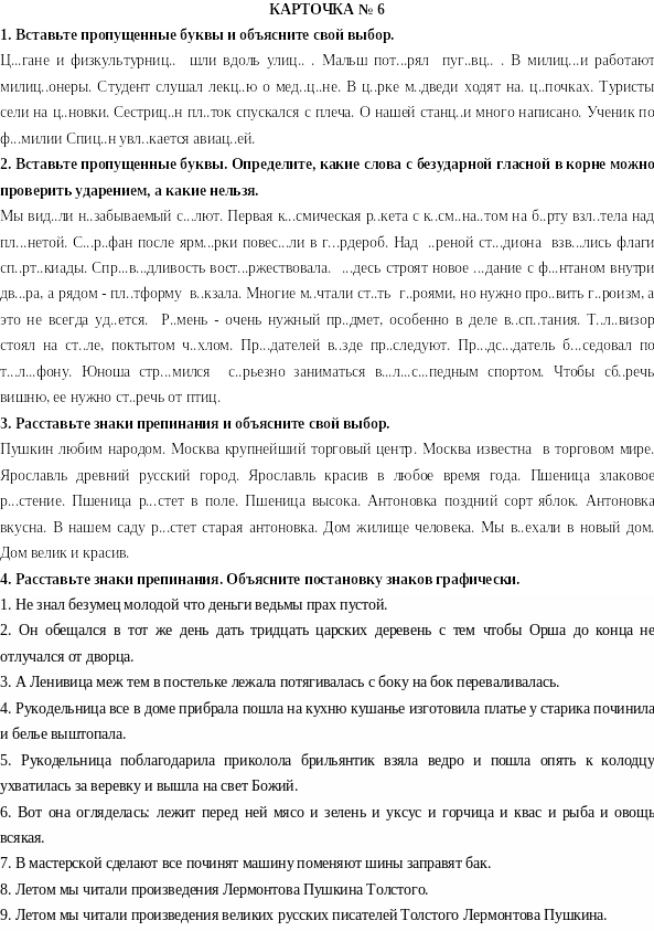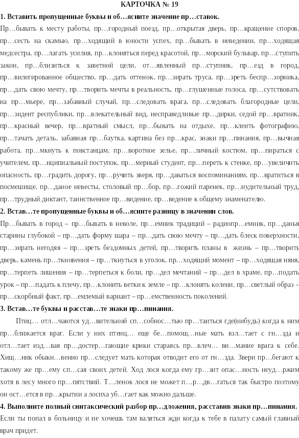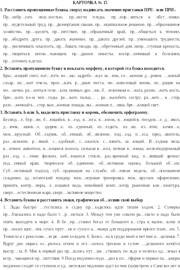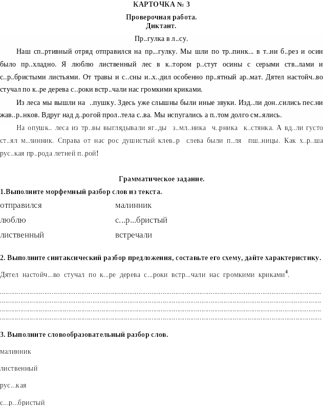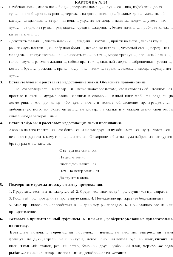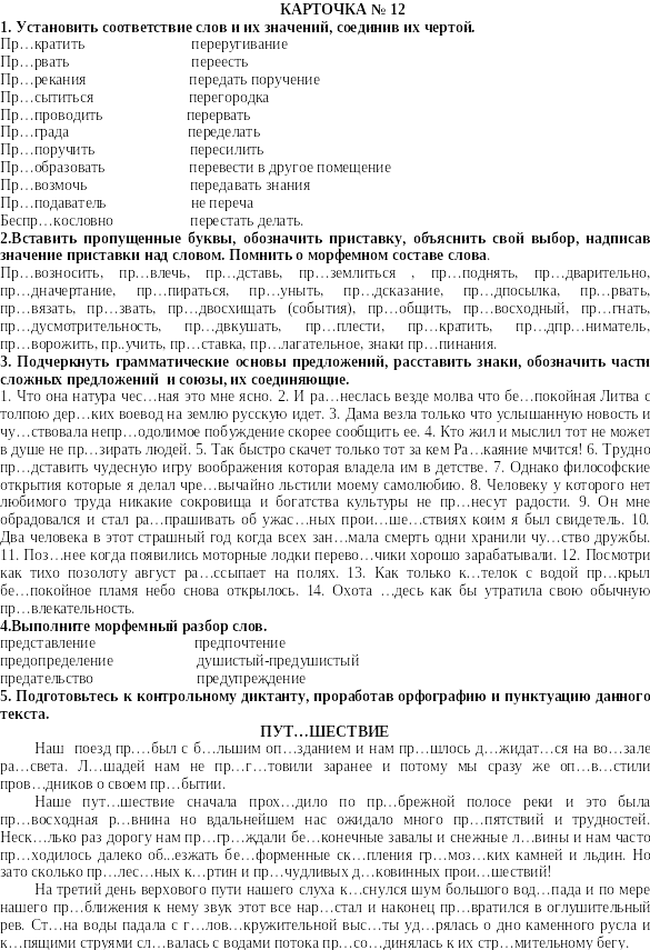 Этот материал может быть полезен для работы с учащимися, которые по тем или иным причинам имеют пробелы в знаниях, образовавшиеся в 5-6 классах. Естественно, что уже в 7 классе такие учащиеся испытывают значительные затруднения в выполнении учебных заданий, контрольных работ, требующих эти знания применить. Дидактический материал оформлен в виде комплексных заданий-карточек. Одно занятие – одна карточка. Двигаясь постепенно, прорабатывая одну карточку за другой, ребенок ликвидирует те белые пятна в материале, которые мешают ему чувствовать себя полноценным участником уроков русского языка. Предусмотрены срезовые работы (карточки так и помечены – срез), помогающие выяснить степень усвоенности материала и откорректировать ход работы.