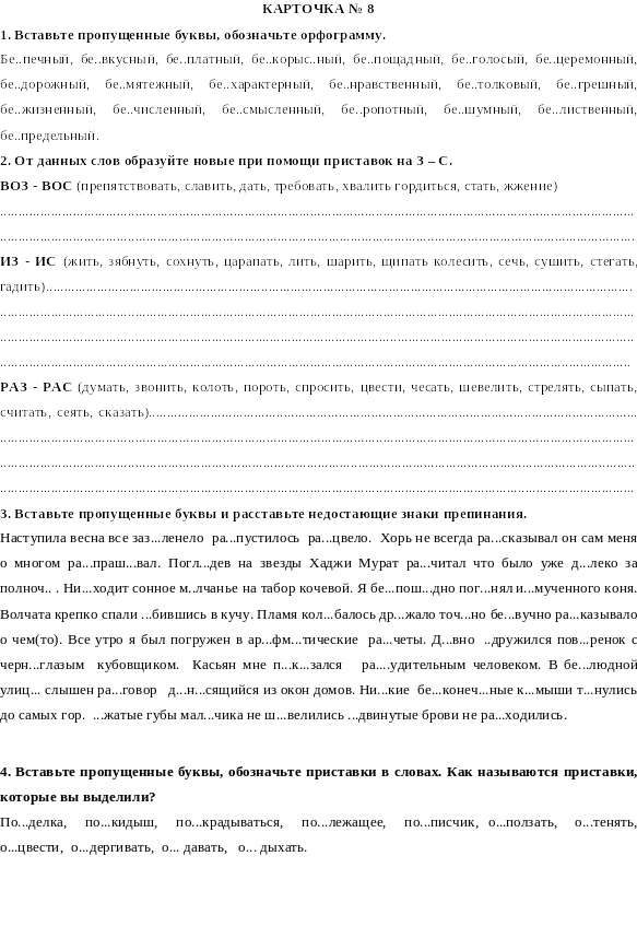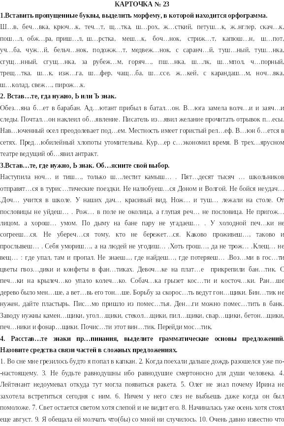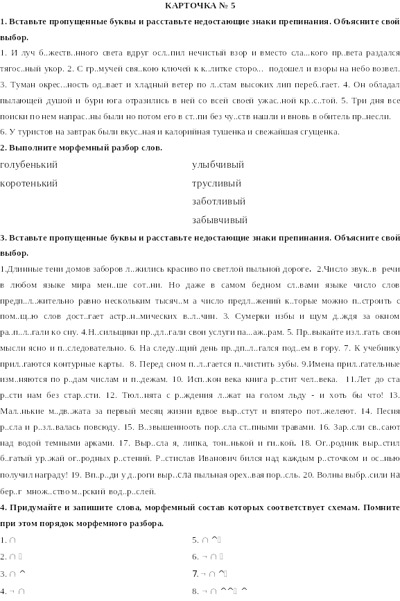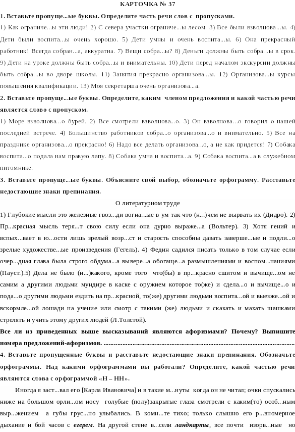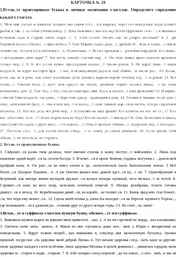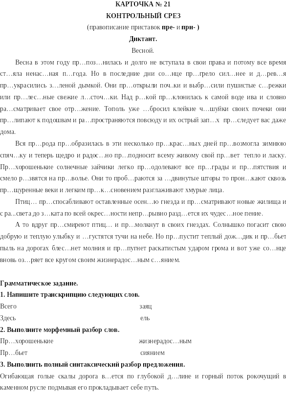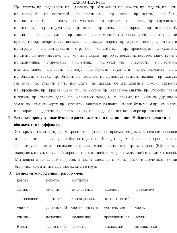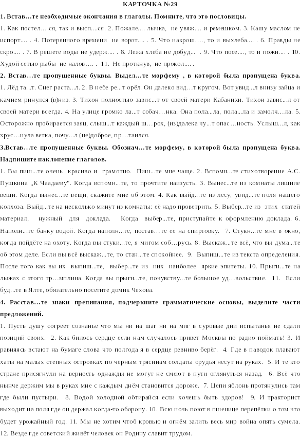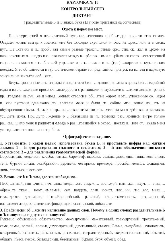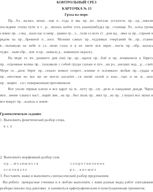 Этот материал может быть полезен для работы с учащимися, которые по тем или иным причинам имеют пробелы в знаниях, образовавшиеся в 5-6 классах. Естественно, что уже в 7 классе такие учащиеся испытывают значительные затруднения в выполнении учебных заданий, контрольных работ, требующих эти знания применить. Дидактический материал оформлен в виде комплексных заданий-карточек. Одно занятие – одна карточка. Двигаясь постепенно, прорабатывая одну карточку за другой, ребенок ликвидирует те белые пятна в материале, которые мешают ему чувствовать себя полноценным участником уроков русского языка. Предусмотрены срезовые работы (карточки так и помечены – срез), помогающие выяснить степень усвоенности материала и откорректировать ход работы.