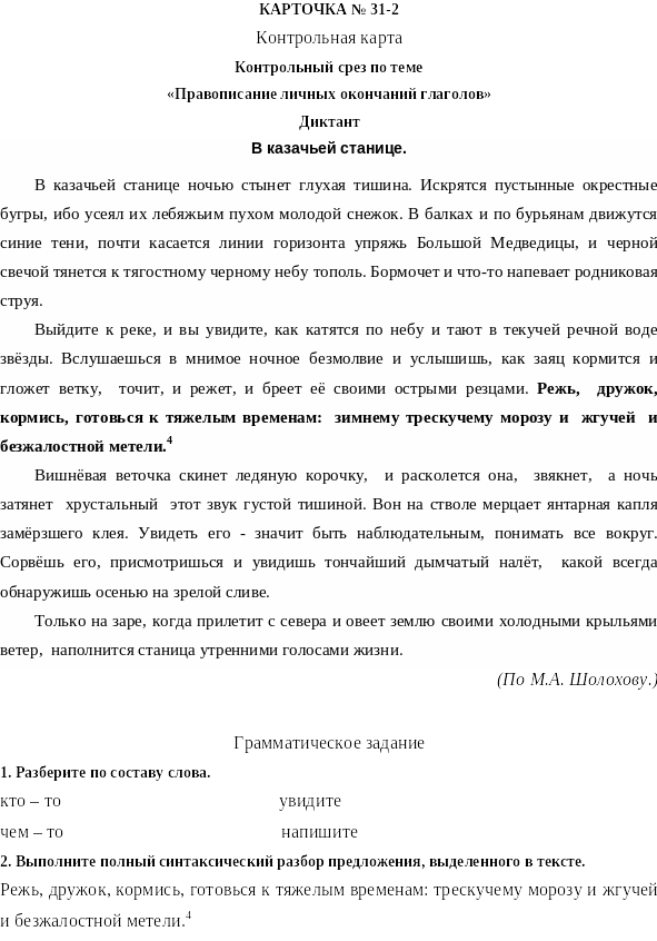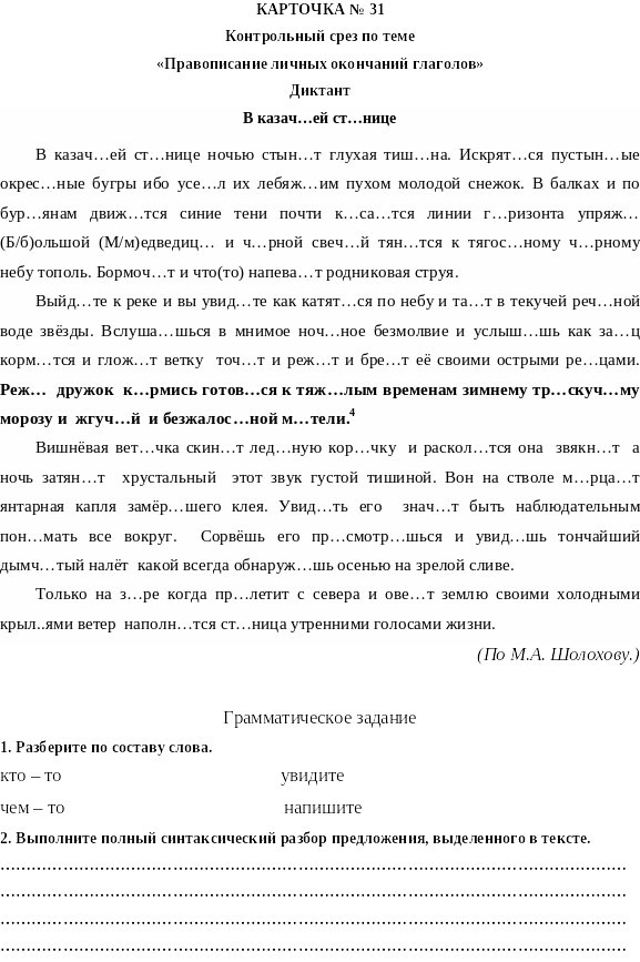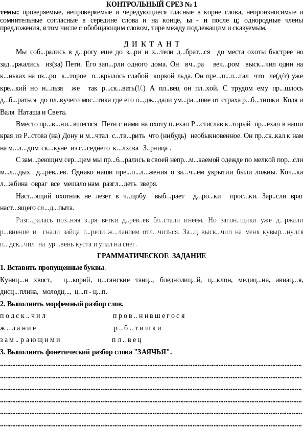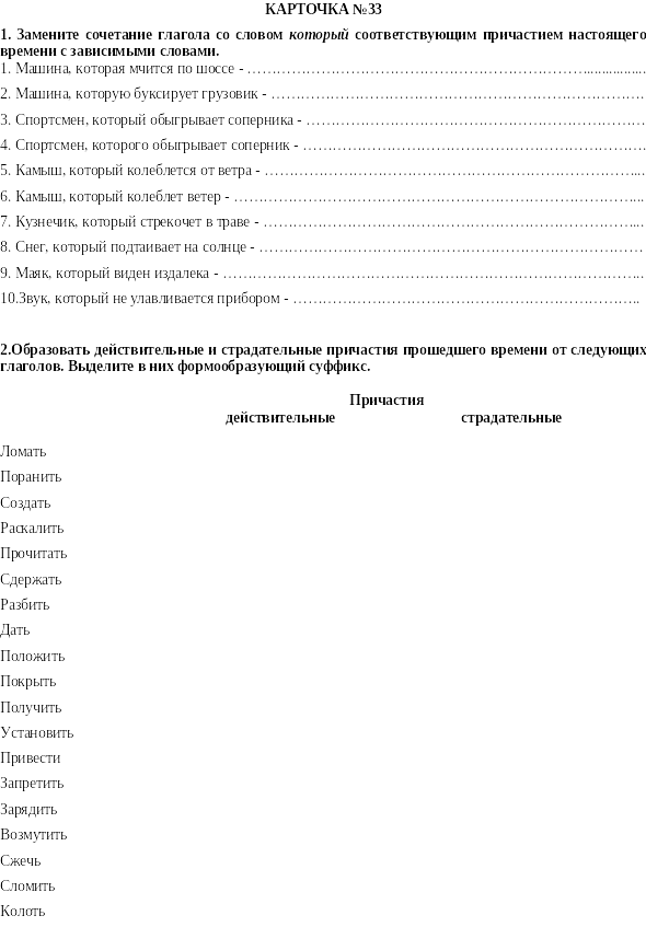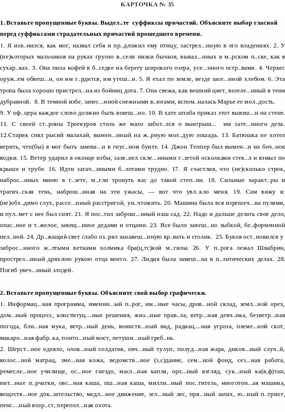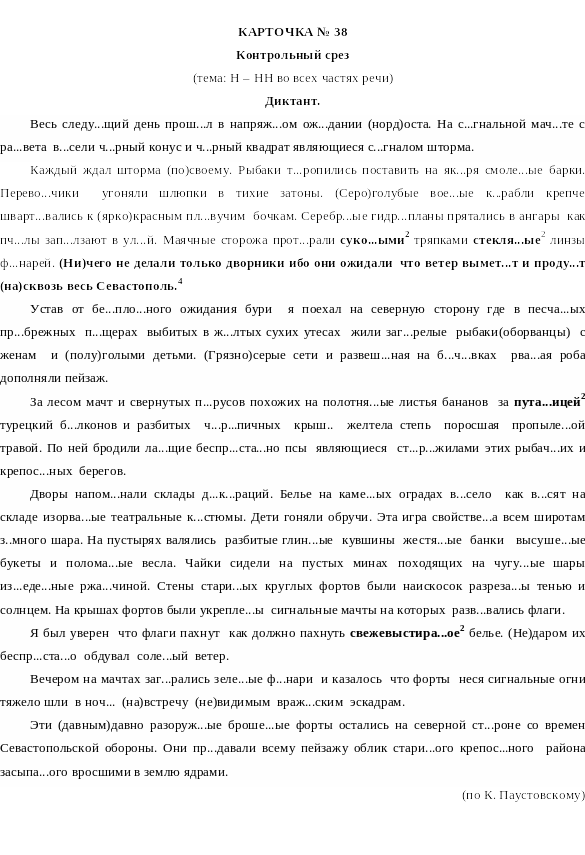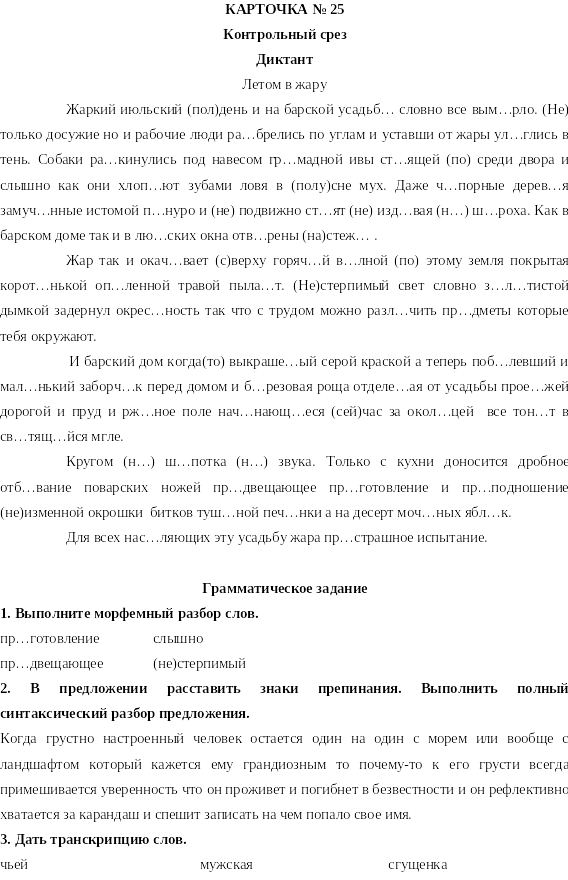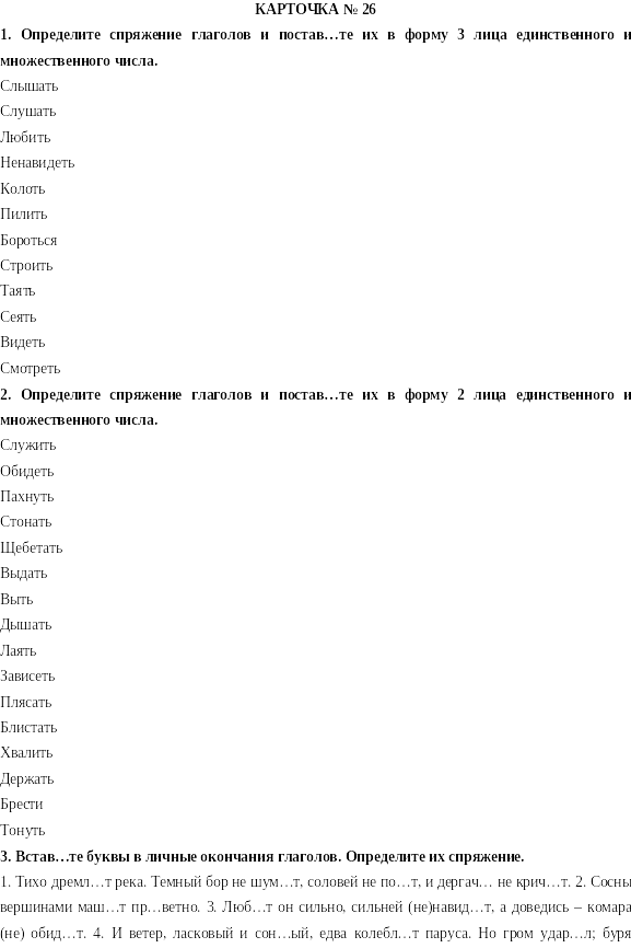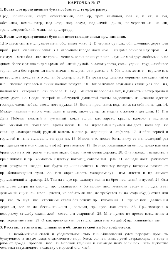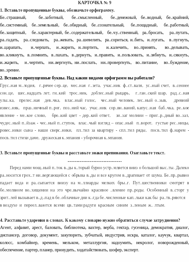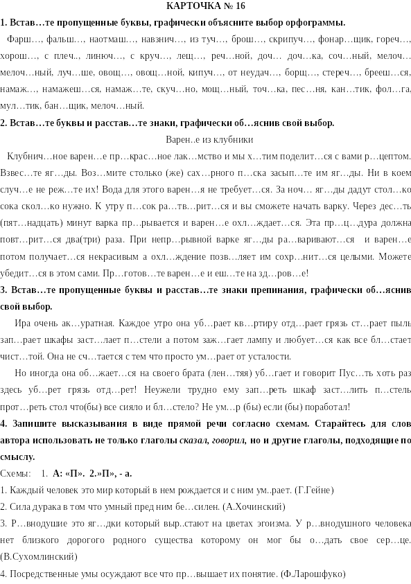Этот материал может быть полезен для работы с учащимися, которые по тем или иным причинам имеют пробелы в знаниях, образовавшиеся в 5-6 классах. Естественно, что уже в 7 классе такие учащиеся испытывают значительные затруднения в выполнении учебных заданий, контрольных работ, требующих эти знания применить. Дидактический материал оформлен в виде комплексных заданий-карточек. Одно занятие – одна карточка. Двигаясь постепенно, прорабатывая одну карточку за другой, ребенок ликвидирует те белые пятна в материале, которые мешают ему чувствовать себя полноценным участником уроков русского языка. Предусмотрены срезовые работы (карточки так и помечены – срез), помогающие выяснить степень усвоенности материала и откорректировать ход работы.