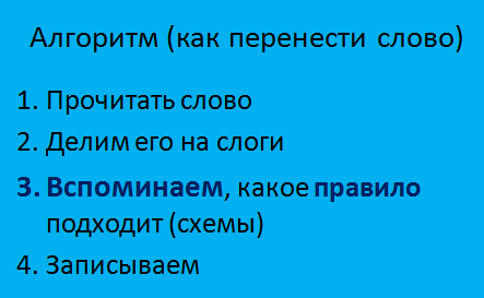 1.Прочитать слово 2.Устно разделить его на слоги 3.Вспоминаем, какое правило подходит. 4. Записать в тетрадь, разделив для переноса.5. Написать на бумаге одно слово, разделив для переноса.6. Нарисовать схему к вашему правилу. 7. Рассказать правило переноса друг другу.