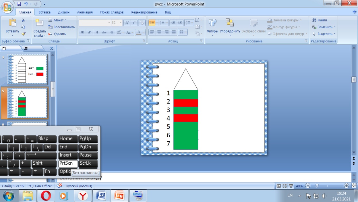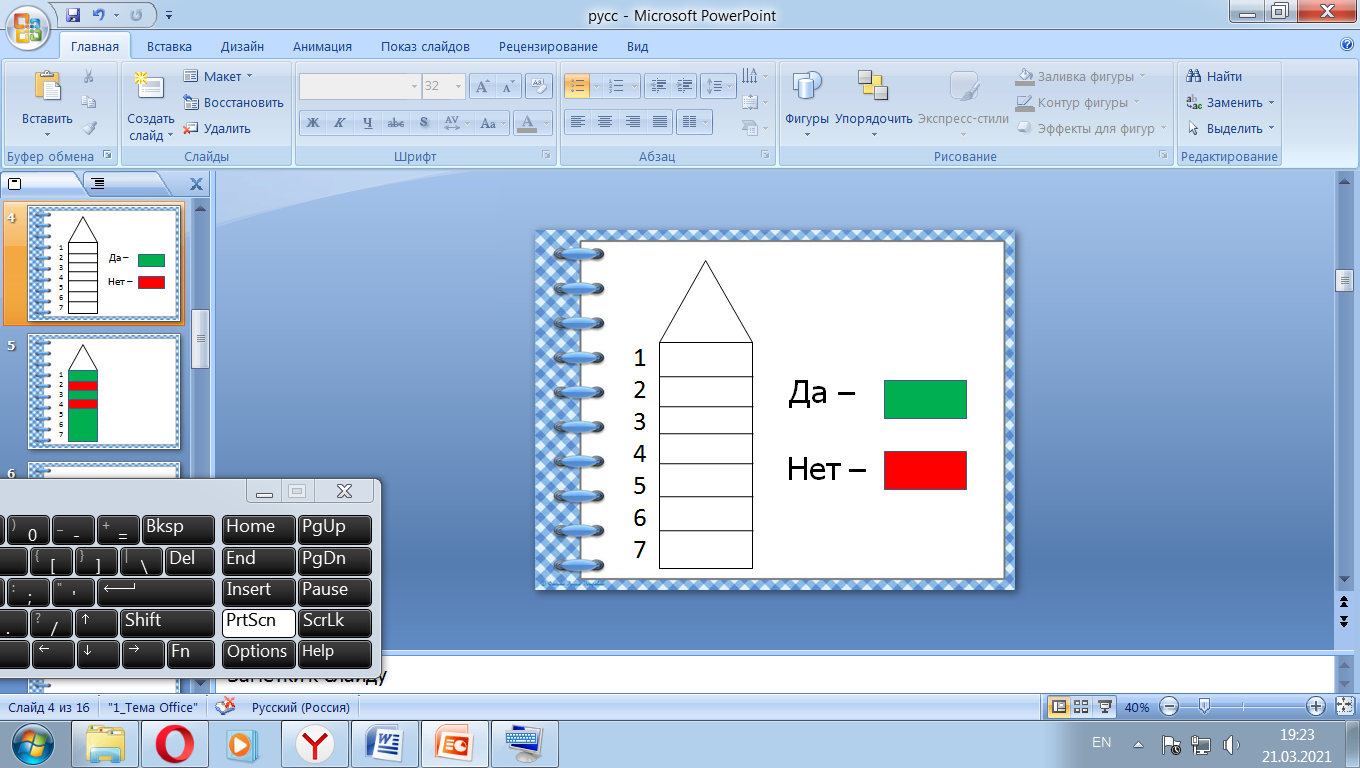 Я вам предлагаю сыграть в игру «Да и нет». Если вы согласны с моим утверждением, то сверху вниз закрашиваете одно деление карандаша зелёным цветом, если не согласны – то красным цветом.