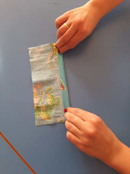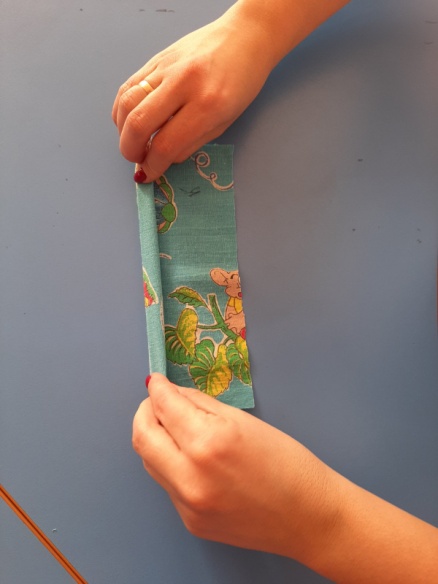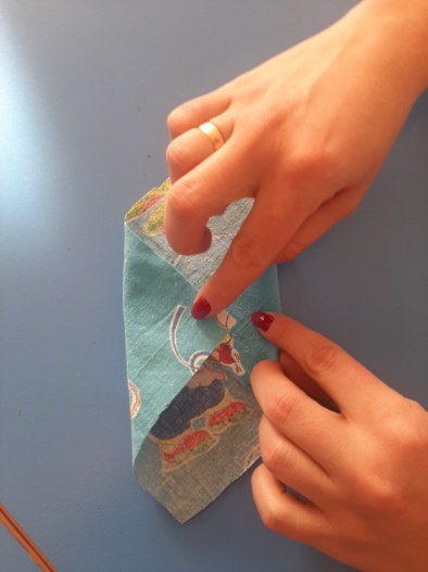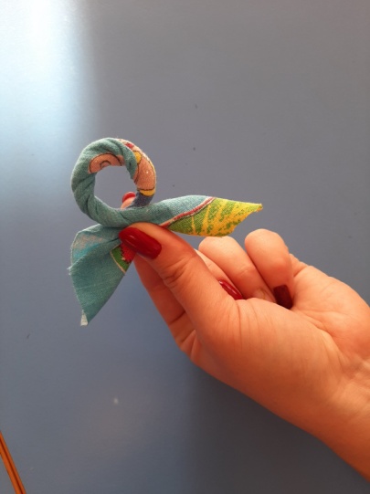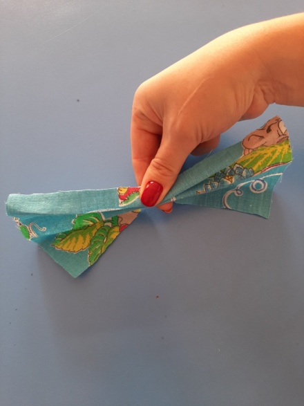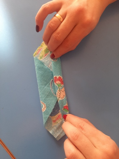 кань в форме квадрата кладём перед собой «ромбиком». В центр загибаем верхний и нижний уголки и сворачиваем ткань в трубочку.