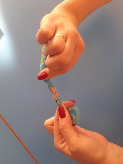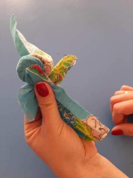 Далее, туго «скручиваем» полученную трубочку, оставляя свободными концы (это будут ручки нашей куколки). И формируем голову. Заготовку можно дать ребенку, чтобы она не ослабла.