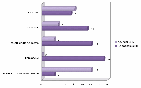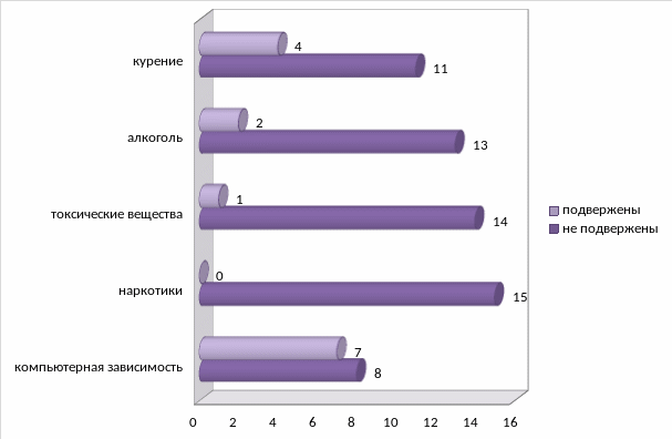 Происходит неуклонное «омоложение» детей, имеющих вредные привычки. Ситуация осложняется тем, что до недавнего времени подверженность вредным привычкам касалась детей из неблагополучных семей, родители которых вели асоциальный образ жизни. В настоящее время пагубным пристрастиям подвержены дети из благополучных семей, семей с высоким достатком. Как правило, недостаток внимания к детям и низкие морально – этические нормы в семье сочетаются с финансовой свободой.