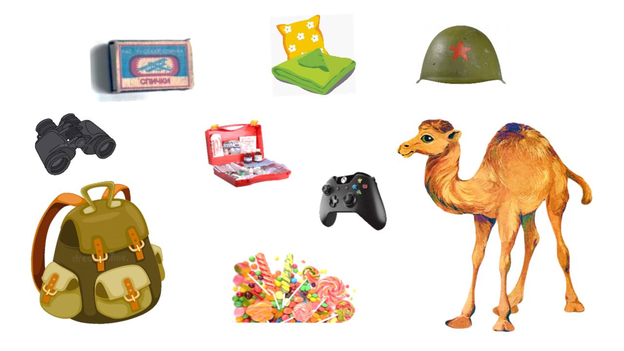- Итак, ваше 3 задание: Помогите верблюду собрать в рюкзак только необходимые вещи, соедините их стрелками, а лишние зачеркните.