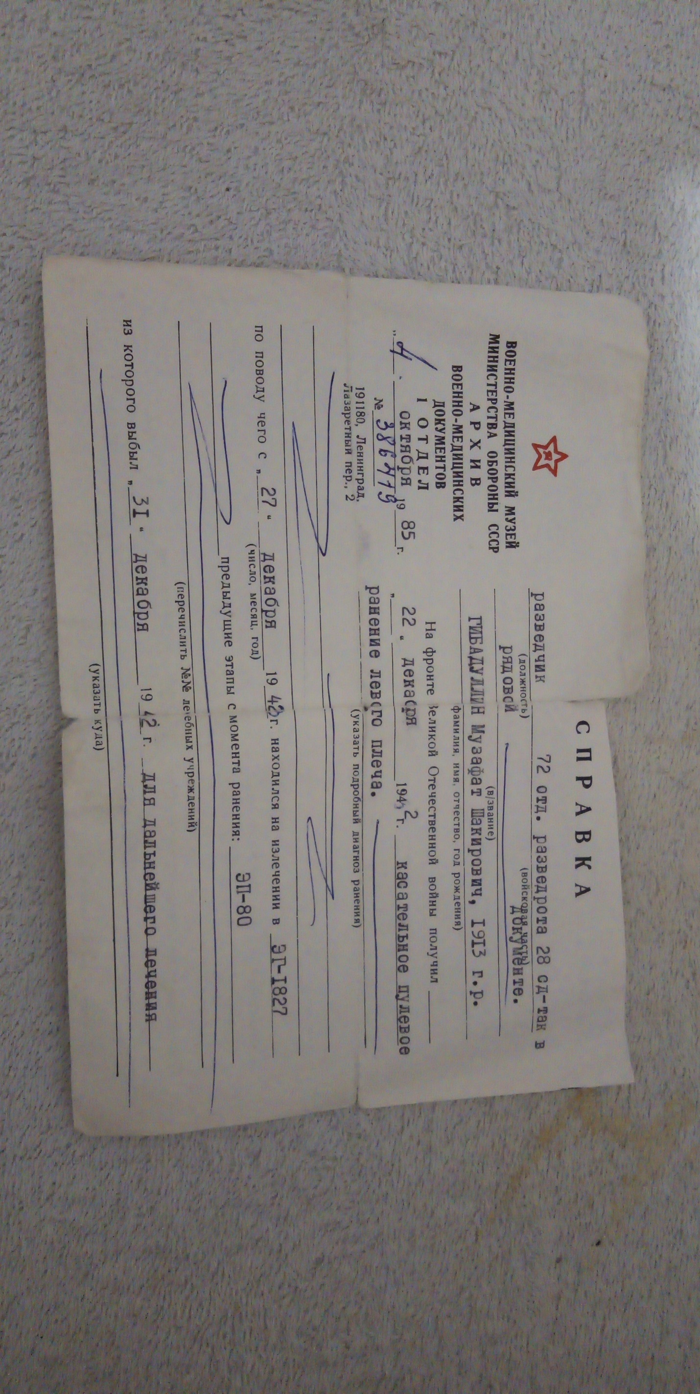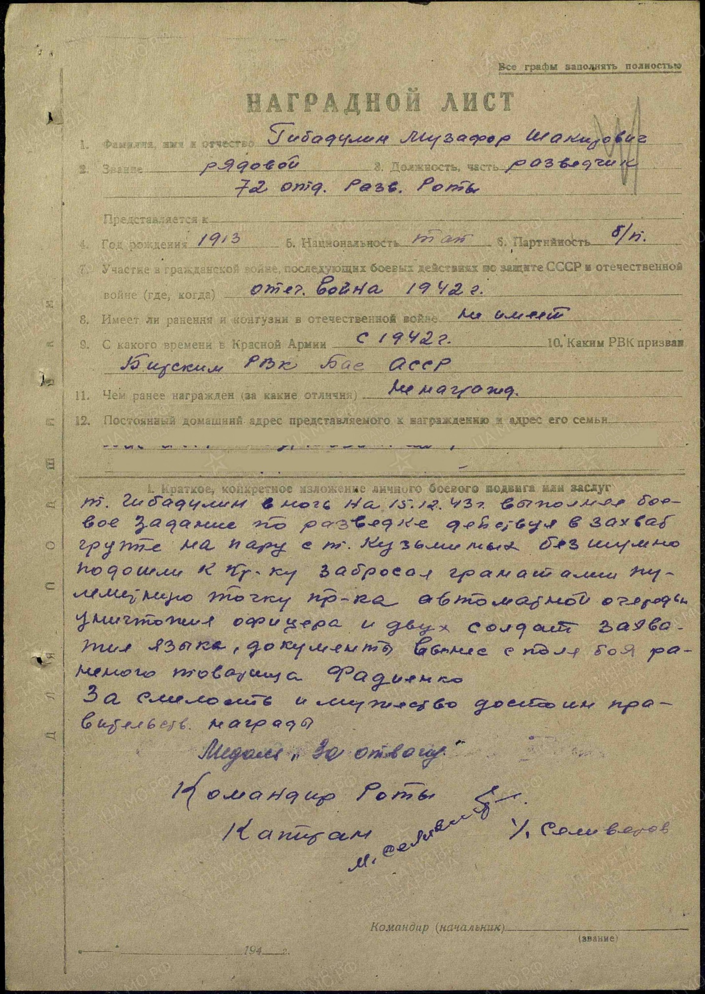 «Мой дедушка Гибадуллин М.Ш. уроженец деревни Семенкино Аургазинского района Республики Башкортостан. 23 января 1913 года рождения. Точную дату призыва я не знаю, но знаю, что он призывался в армию в 1942 году. Из справки о ранении значится, что он служил в 72 отдельной разведроте 28 стрелковой дивизии и был разведчиком. Ранение он получил 22 декабря 1942 года и находился на излечении в ЭГ -1827.
