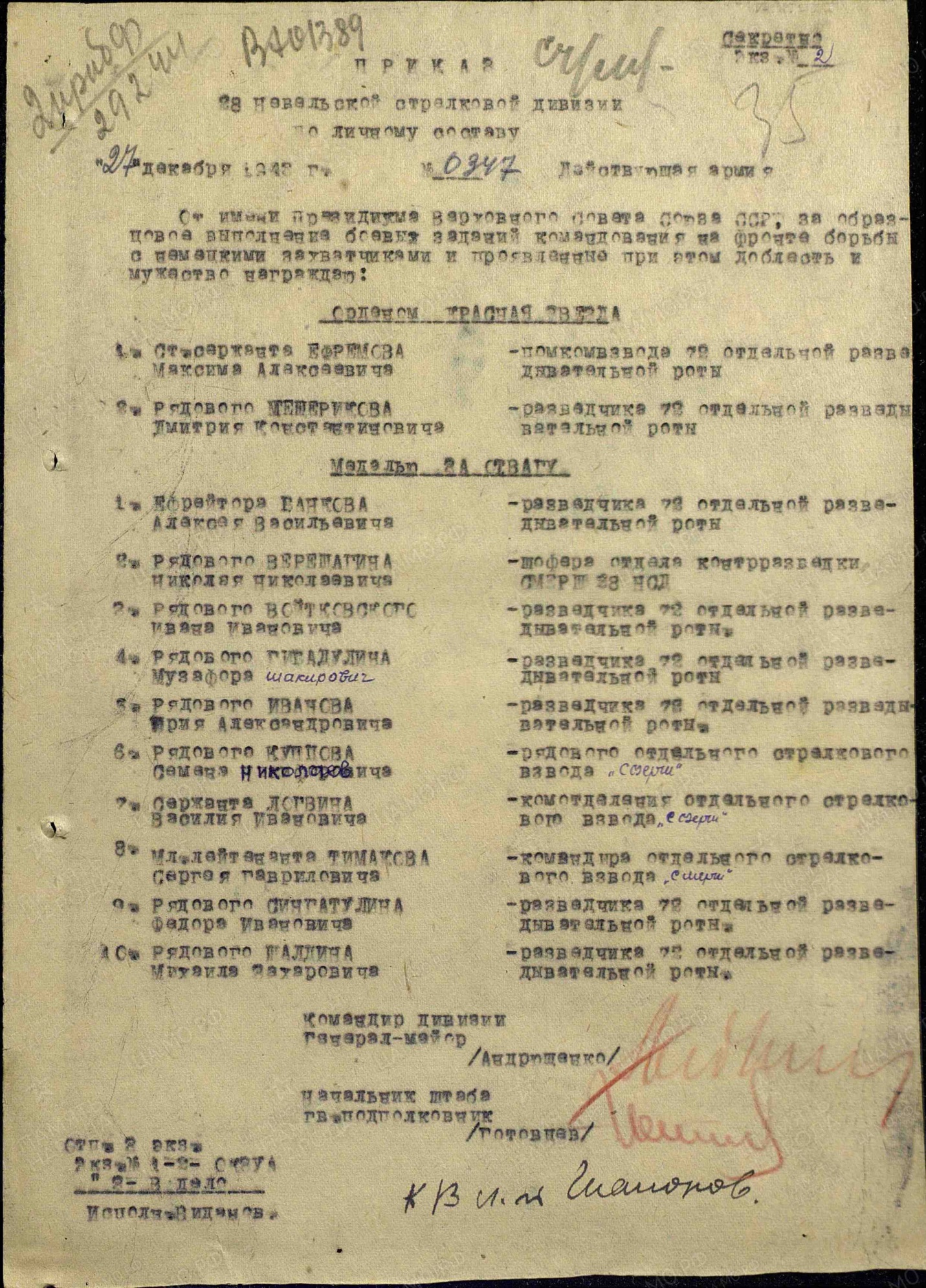 Он мало рассказывал о ВОВ, воспоминания были тяжелыми. Но эпизод, за что получил медаль «За Отвагу» рассказал. 15 декабря 1943 года, выполняя задание по разведке, действуя в захват группе на пару с товарищем Кузьминым, бесшумно подошли к противнику, забросал гранатами пулеметную точку противника, уничтожил офицера и двух солдат, захватил языка, документы, вынес с поле боя раненого товарища.