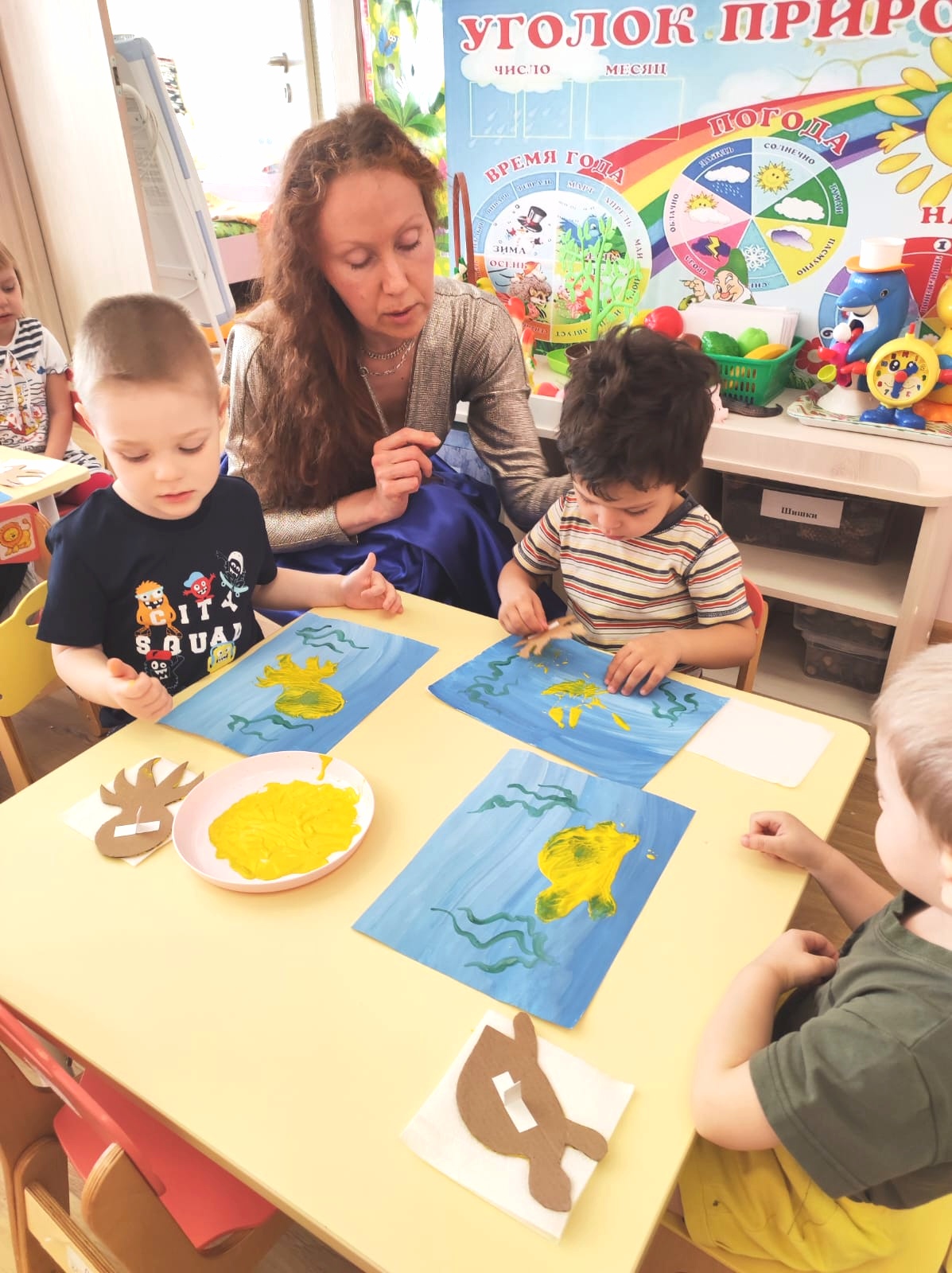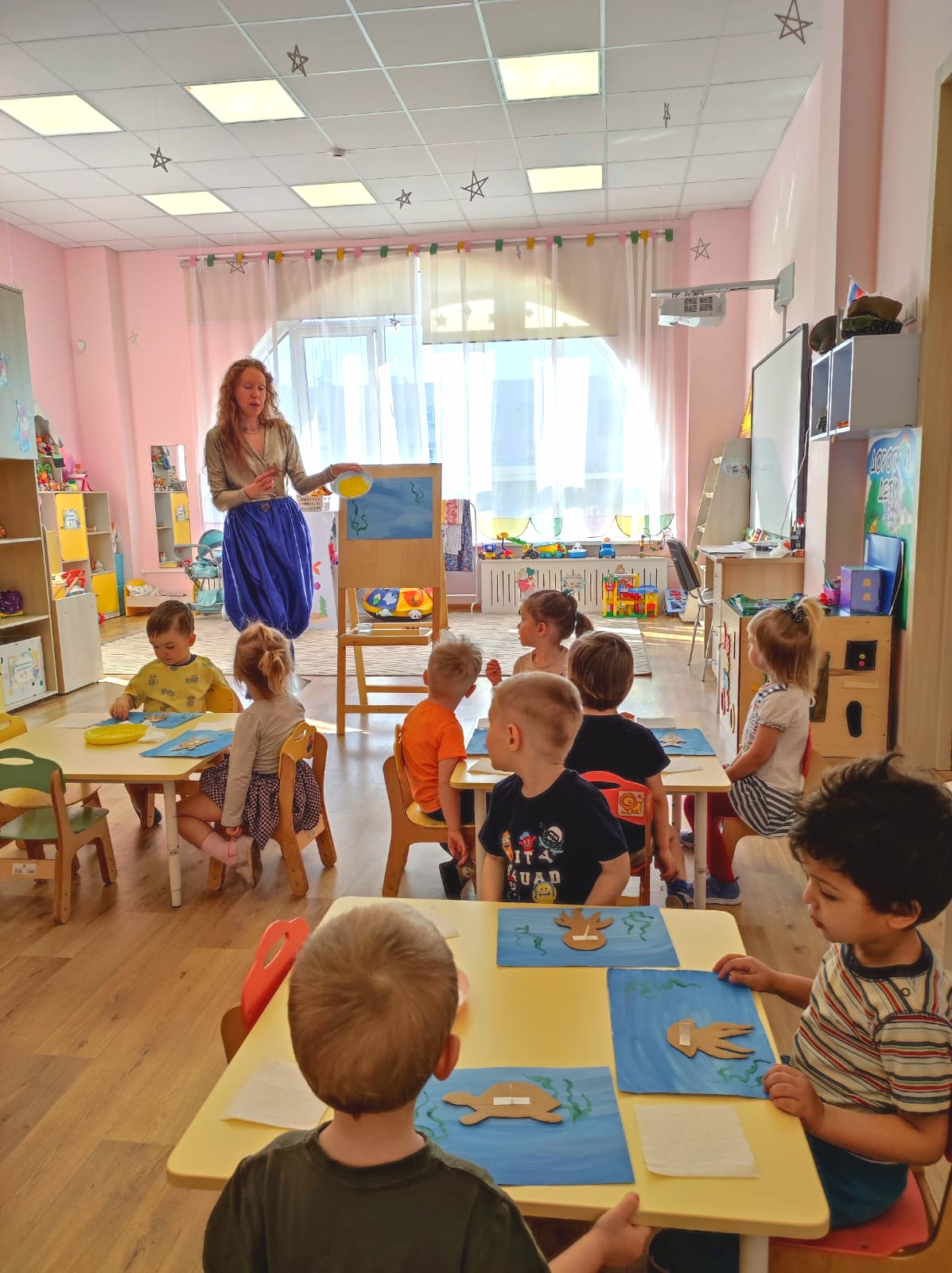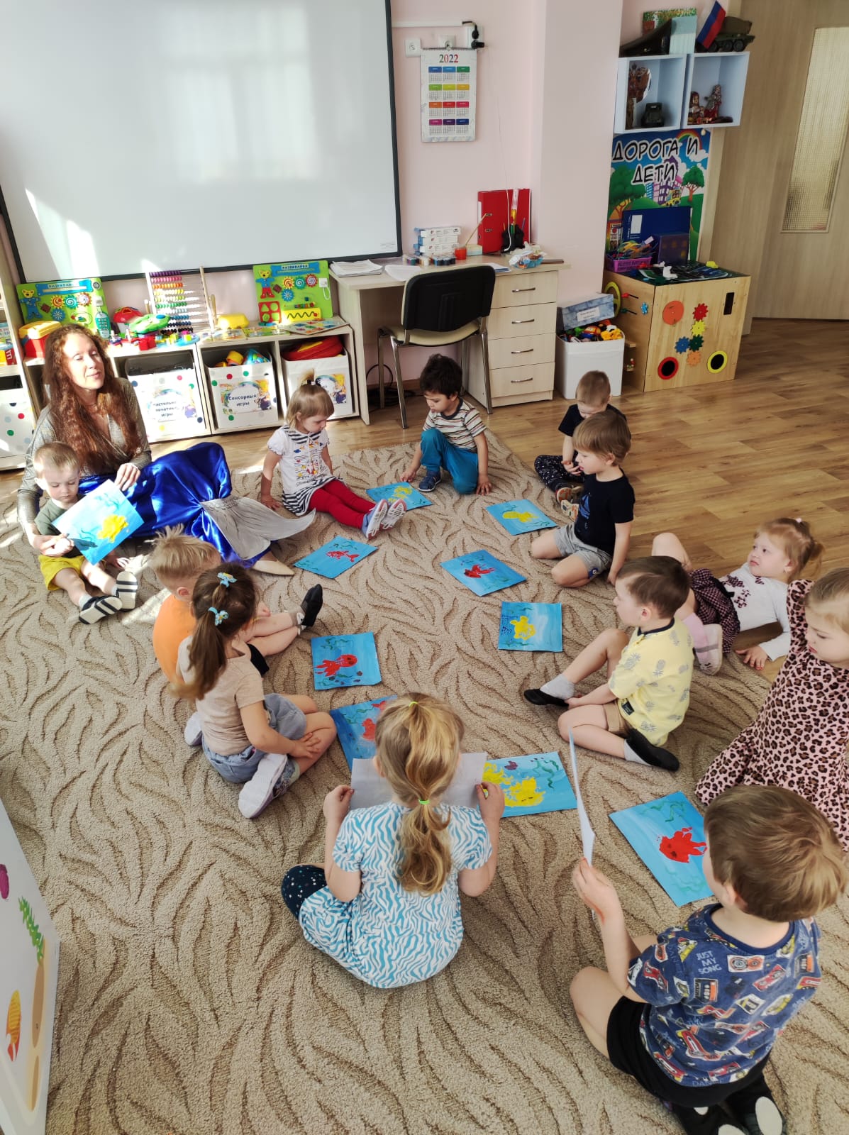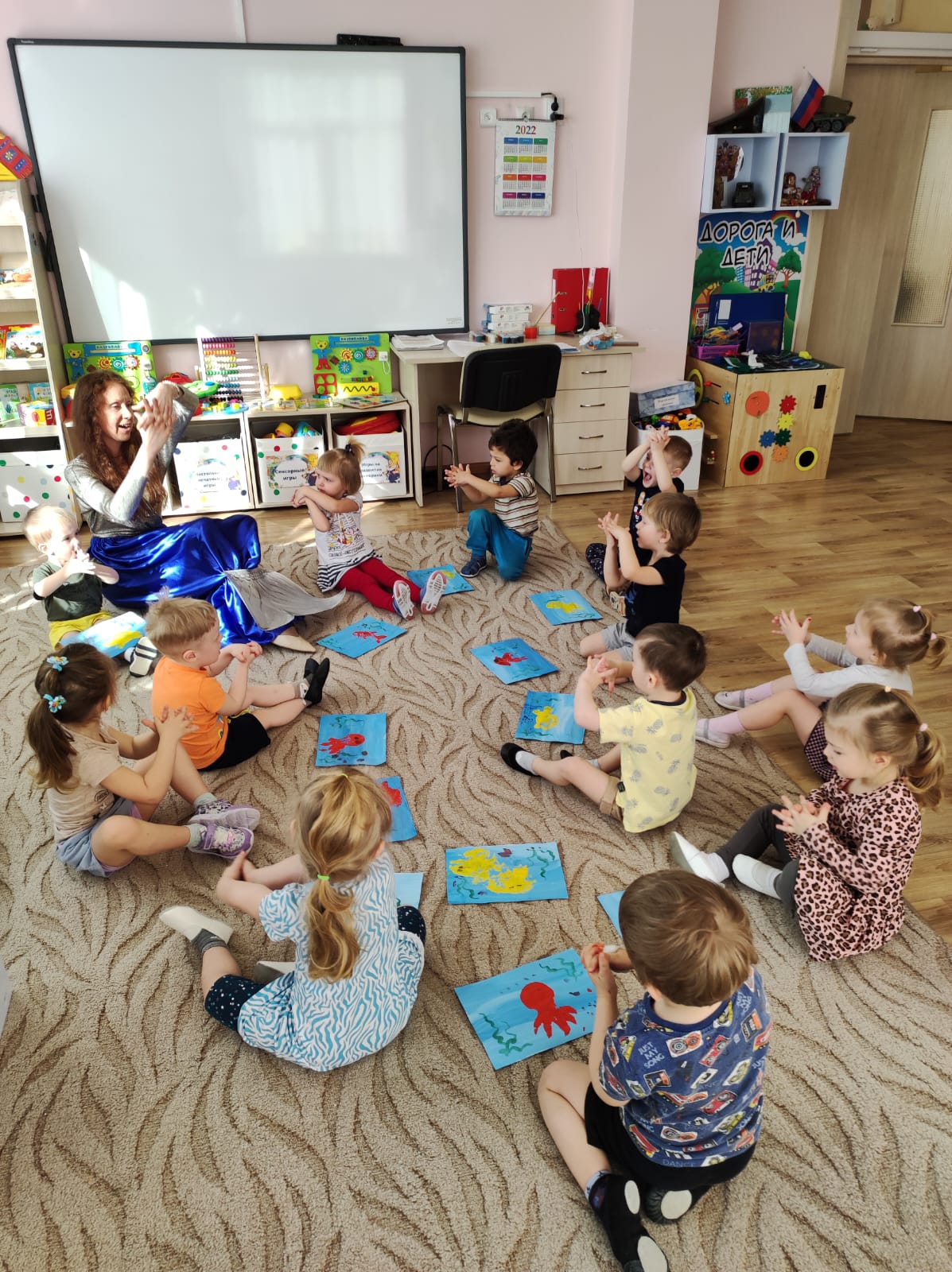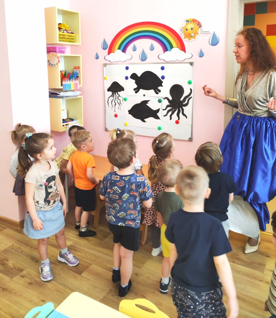 - Дорогие волшебники, ваше доброе волшебство получилось! Аккуратно возьмите свои рисунки и выходите сюда, к морю. Опустите морских жителей в воду (в центр, на ковер).