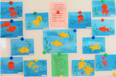 Материалы и оборудование: музыка «Шум моря», «волшебная палочка» (указка), костюм Русалочки, плоскостные изображения черного цвета: черепахи, медузы, осьминога, рыбки (демонстрационный материал на магнитной доске), тонированная альбомная бумага (морское дно) на каждого ребенка, кисти №1 белка, салфетки влажные и сухие, гуашевые краски на тарелочках, баночки с водой, мольберт с образцом для рисования, печатки на каждого ребенка (вырезанные из плотного картона: черепахи, медузы, осьминоги, рыбки.