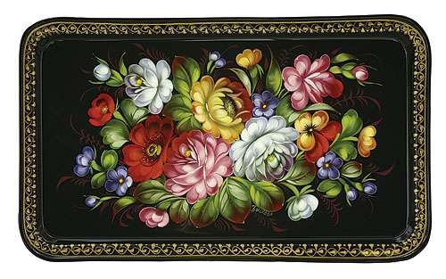 Каждый поднос неповторим, расписывается от руки масляными красками без применения трафаретов и образцов, то есть по воображению.