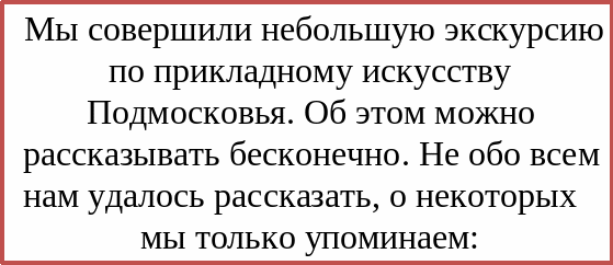 А теперь— давайте посмотрим фильм об истории возникновения художественных промыслов Подмосковья.
