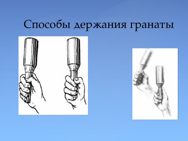 Из положения стоя на левой ноге с отставленной назад правой и выпрямленной рукой вверх-назад броски гранаты вперед-вверх (при правильном выпуске граната вращается в вертикальной плоскости;