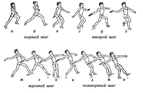 Подготовка к броску. Бросковыми шагами называются последние 4 шага разбега. На протяжении этих шагов занимающийся, отводя гранату назад на выпрямленную руку, выводит вперед нижнюю часть тела и готовится к финальному усилию.