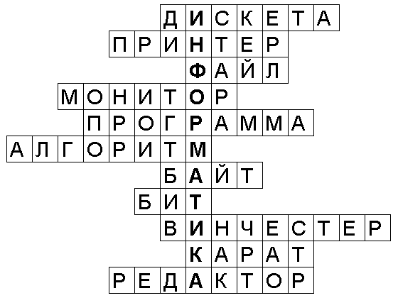 1. Дискета. 2. Принтер. 3. Файл. 4. Монитор. 5. Программа. 6. Алгоритм. 7. Байт. 8. Бит. 9. Винчестер. 10. Карат. 11. Редактор.