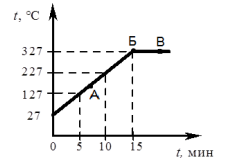 На рисунке представлен график зависимости температуры от времени для процесса нагревания слитка свинца массой 1 кг.