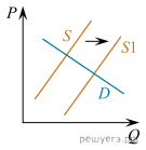 7. На графике изображено изменение ситуации на потребительском рынке роликовых коньков в стране Z. Кривая предложения переместилась из положения S в положение S1 при неизменном спросе D. (На графике P – цена товара; Q – количество товара).