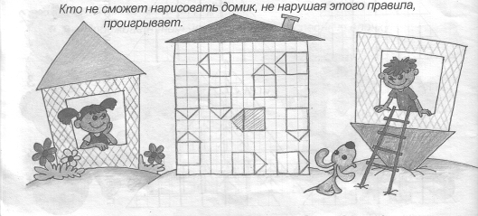 а один ход нужно нарисовать в квадрате по клеточкам один домик – такой же, как заштрихованный, но повёрнутый в любую сторону. Домики не должны касаться друг друга.