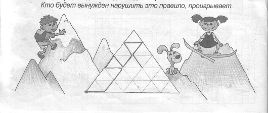 Начало игры в выделенной точке. Из этой точки начинают рисовать ломаную. За один ход обводят какую-нибудь сторону маленького треугольника. Ломаная может пересекать и касаться себя, но дважды обводить один отрезок нельзя.