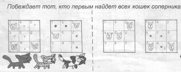 Эта игра похожа на «Морской бой». У каждого игрока – по два квадрата с пронумерованными клеточками. В левом квадрате каждый втайне от другого рисует трёх кошек. Чтобы обнаружить, где находятся кошки соперника, игрок задаёт один вопрос, на который можно ответить только «да» или «нет», например: «В седьмой клеточке есть кошка?» или: «На первом этаже есть кошка?». Узнав, что в клеточке есть кошка, игрок рисует её в соответствующем месте правого квадрата, в противном случае, ставит в нём точку.