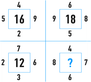 В первых трёх случаях получается центральное число, используя последовательную комбинацию «+», «-», «+» и двигаясь по часовой стрелке: 4+9-2+5=16; 6+8-5+9=18; 7+6-3+2=12. По этой же схеме решается последний пример: 4+7-6+8=13.