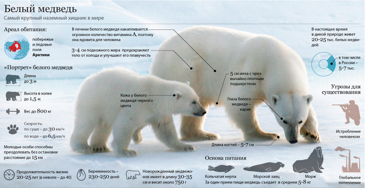 Рассмотрите инфографику. Найдите информацию о белом медведе, которая не встречалась в текстах. Придумайте «тонкие» и «толстые» вопросы