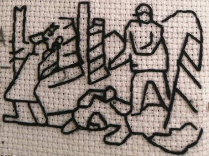 Каждая буква книги вышивается высотой девять миллиметров. Печатные шрифты текста книги вышиты швом « назад иголка» (у вышивальщиц он называется бэкстич). Этим швом без сокращений вышивается содержание текста. Иллюстрации вышиты крестиком по найденным схемам, тематически визуализирующим содержание рассказа.