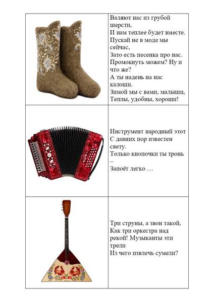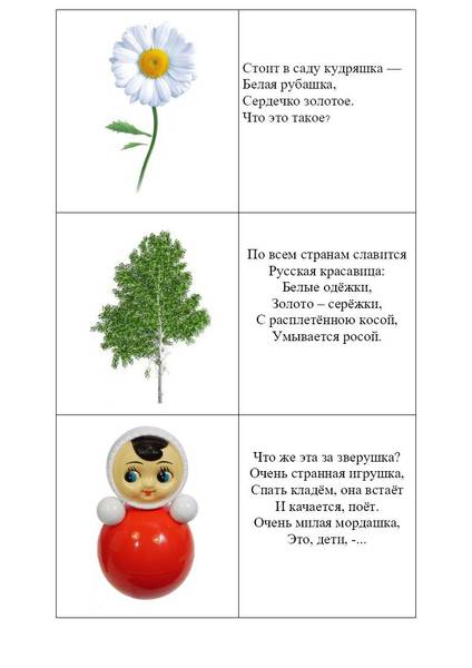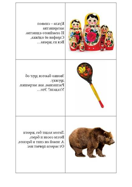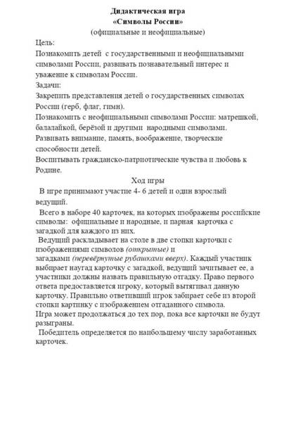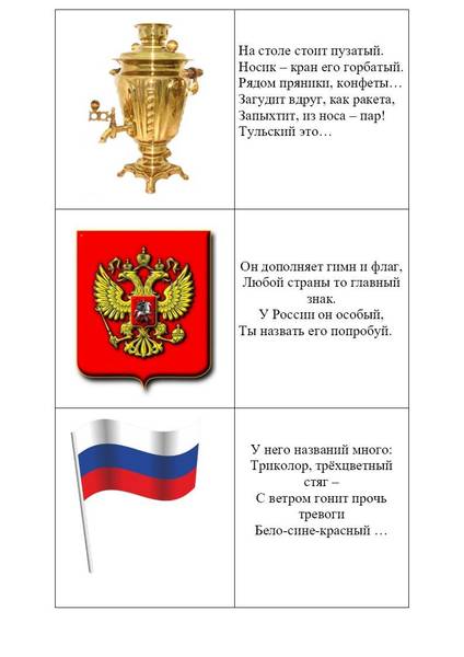 В игре принимают участие 3-4 ребенка и один взрослый ведущий. Участники рассматривают официальные и неофициальные символы России. Каждый участник выбирает карточку, ведущий зачитывает загадку, кто первый отгадает тот и забирает себе карточку. Если дети не могут отгадать загадку, можно рассмотреть с ними картинки и поговорить с чем же ассоциируется у нас каждый символ России.