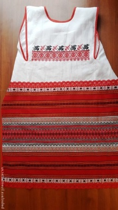 3 | Женская одежда в виде платья без рукавов, сшитая из косых клиньев, со швом спереди или из одного полотна, на широких лямках или с оплечьем, украшенная тесьмой, кружевами, висячими пуговицами. |